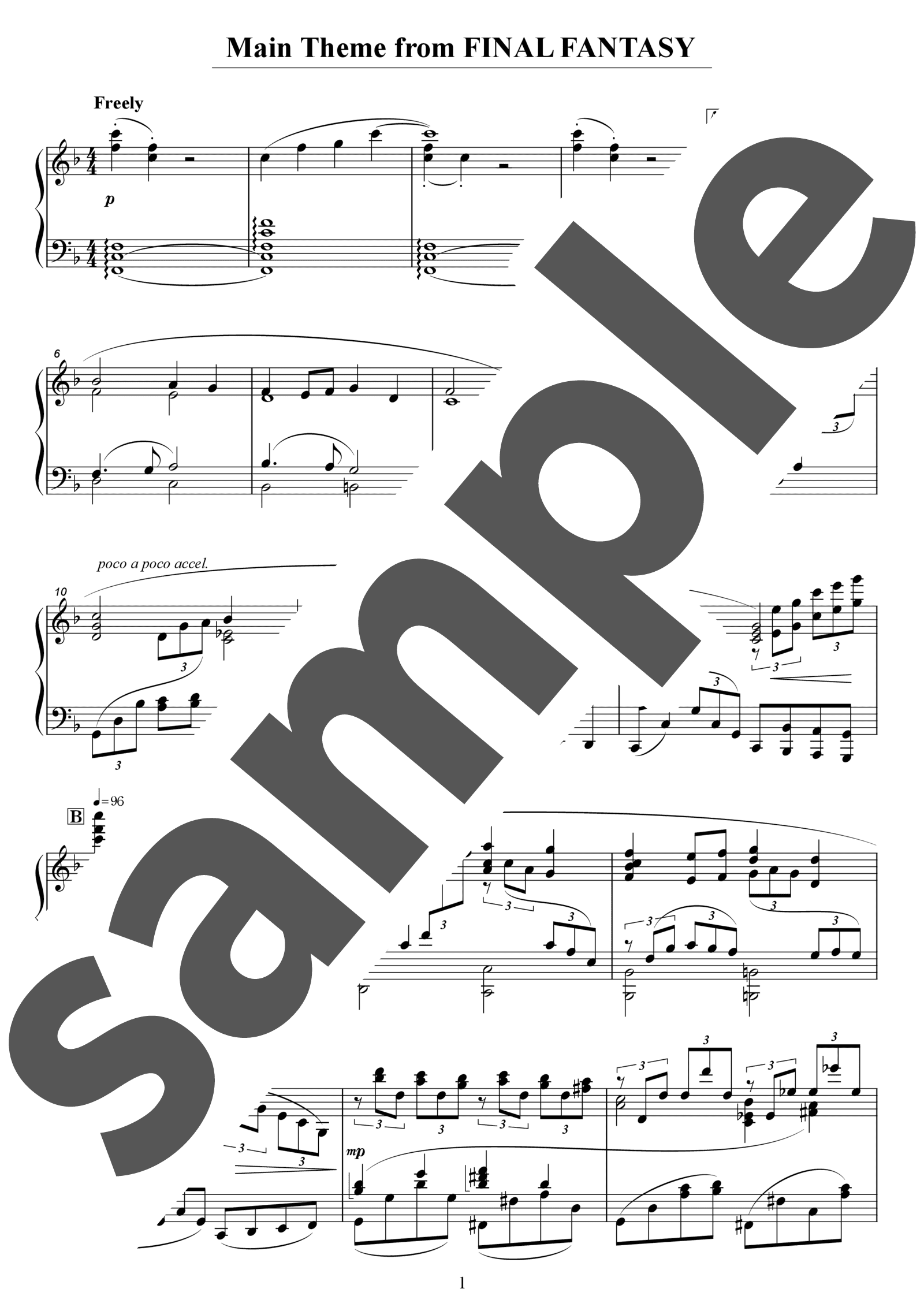 「FINAL FANTASY」シリーズを象徴する楽曲であり、旅立ちと"物語の始まり”を音楽で描いたテーマです。こちらは、下村陽子によるドラマティックなアレンジ音源をもとにピアノソロ用の楽譜としてまとめています。原曲の旋律を土台にしながら、和声の厚みや音域の拡張、内声の動きが加えられ、音楽はより立体的でドラマティックな表情を見せます。まるでピアノ・コンチェルトのような壮大さと華やかさを、ピアノ一台で存分に味わえるアレンジです。