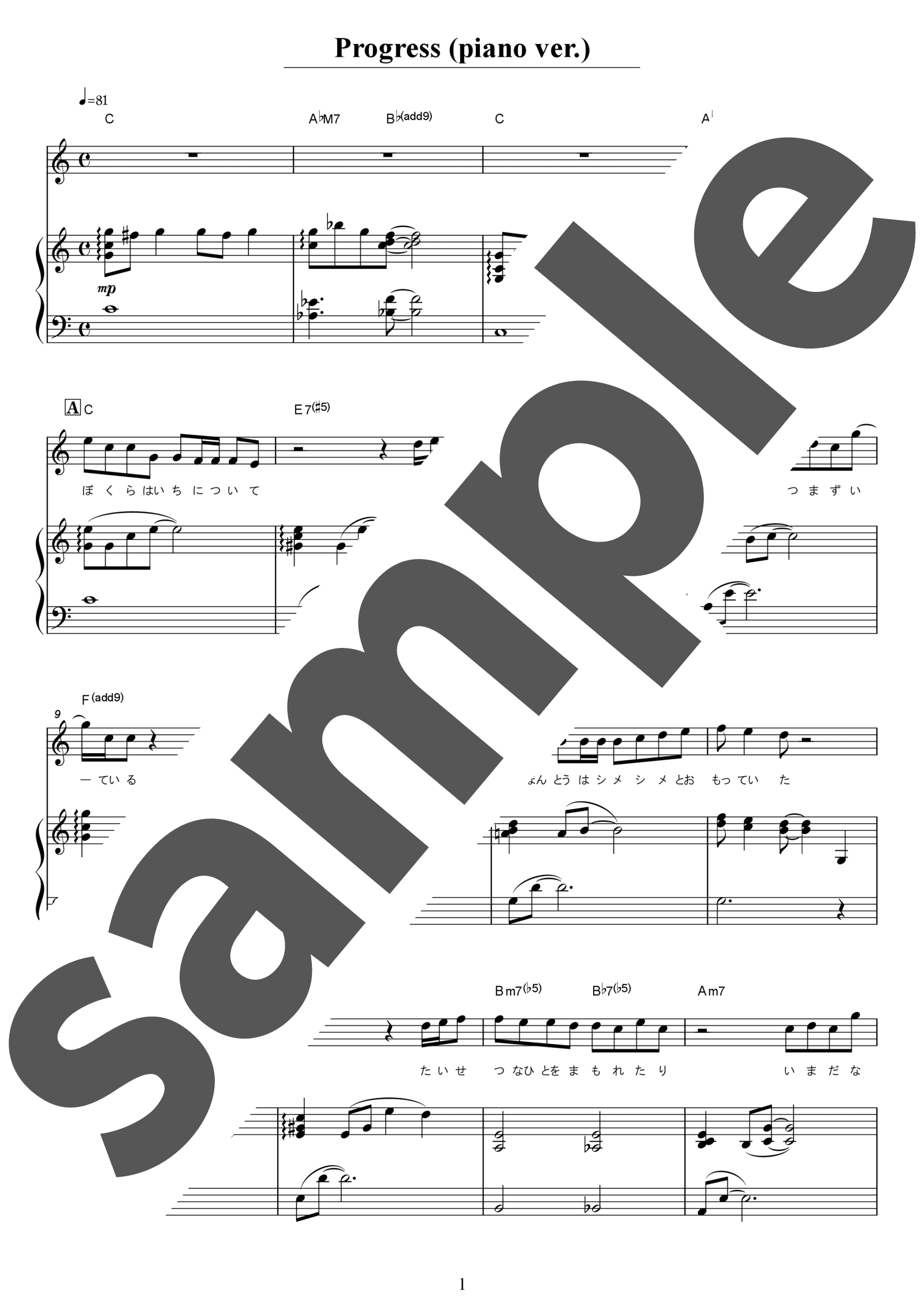 NHK「プロフェッショナル 仕事の流儀」の主題歌として知られる、スガシカオの「Progress」。内省的な歌詞と、温かくも力強いメロディが印象的な楽曲です。今回のピアノとボーカルのみというシンプルな編成は、芯のあるメッセージをより深く際立たせています。ボーカルは素直に歌い上げることで、楽曲のメッセージがより伝わります。伴奏は、冒頭は語りかけるようなタッチでやわらかく始め、Dからは輪郭のはっきりしたタッチで、鋭い音を織り交ぜましょう。